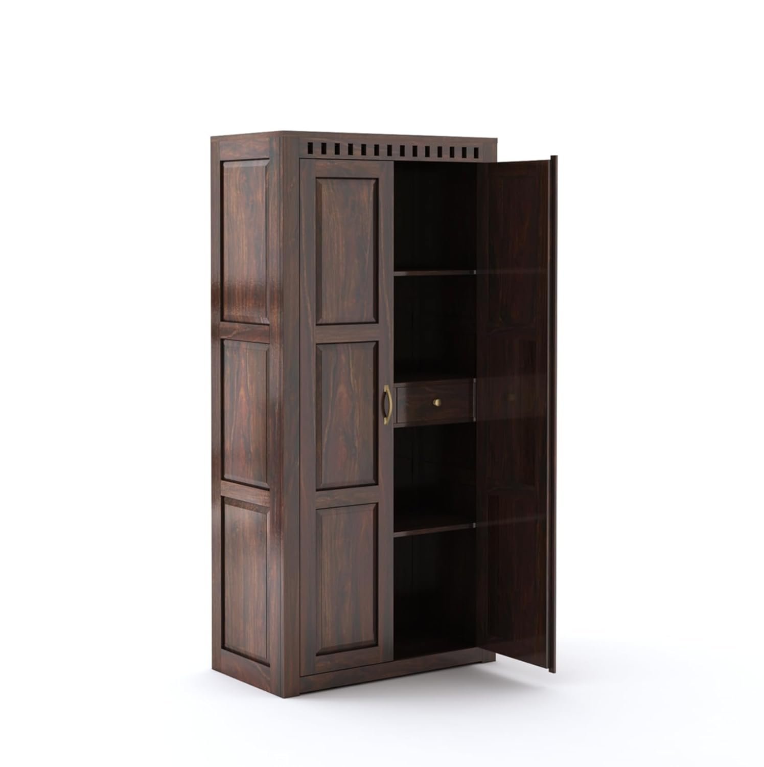 - Primary Material: Solid Sheesham Wood, Color: Walnut Finish, Model: Wooden Almirah for Clothes